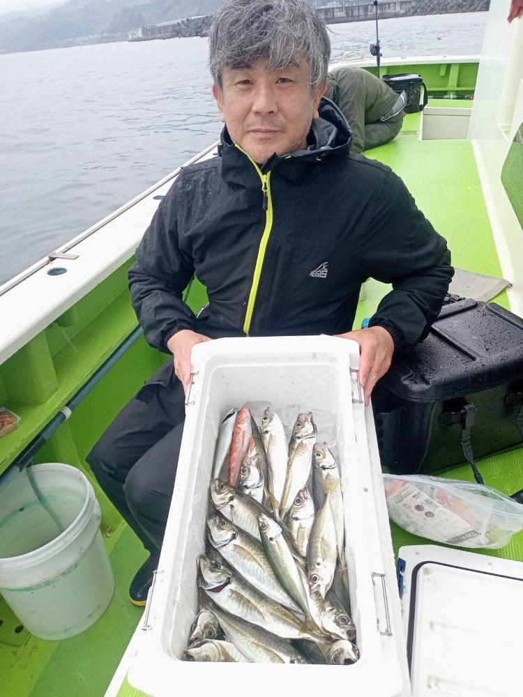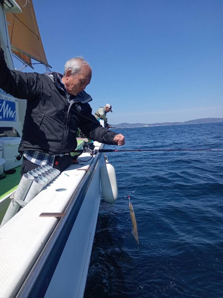 1日、今日から4月、新年度の始まりです。今日は、朝のうちは良いお天気でしたが、10時過ぎには雨が・・・。その後は、降り続いてしまいました。風は、北寄りの風でしたが、昨日の低気圧の影響か、海上は、うねりが残っていて、多少海が悪かったです。今日は、「ヤリイカ船」のみの出船でした。