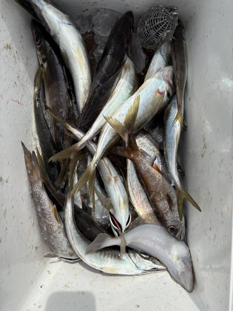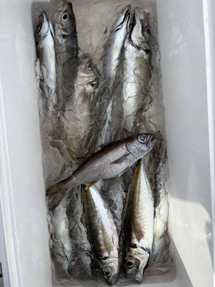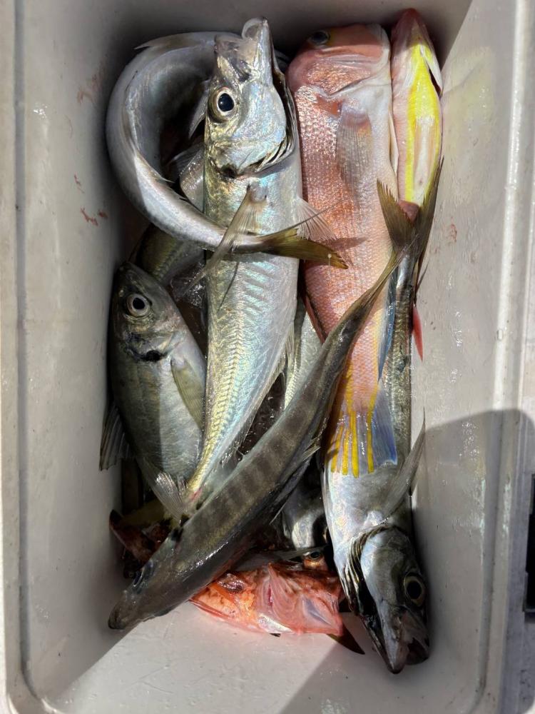 6時半~7時出船(揃い次第出船)・12時半~13時沖上がり(6時間操業) オキアミ別・氷付き オモリ80号 ウイリーのシャクリ釣りになります。アジをメインに、色々な魚を狙います。