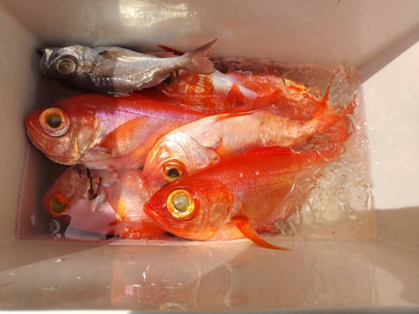 25日、今日も出船出来ました。真鶴沖に行ってみました。しかし、今日は、何処をやっても当たりが出ません・・・。深みでスミヤキの顔を見た程度で、良い所無かったです。中盤は、小田原沖に戻り、転々とやってみましたが、シロムツの顔を見た程度・・・。最後に深みを狙ってみると、ようやく良型キンメの顔を見れました。しかし、皆に当たりが回るような景気は無かったです。という事で、今日は、キンメ0~3枚・28~35cm、スミヤキが交じりました。