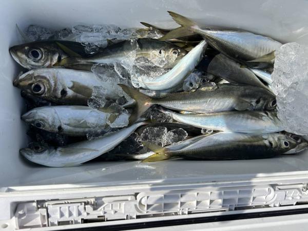 6日、久しぶりの出船です。二宮沖に行きました。朝一から反応が見れ、すぐにアジの顔を見れましたよ!!型も大型主体でした。朝のうちは、食い自体がイマイチなのか、当たりを待つ感じでした。その後、型は中型主体に変わると、食いが良くなり、入れ食い状態に!!結局、帰りまで動くことなく、アジの顔を見れていました。という事で、今日は、アジ25~44匹・24~35cm、サバは顔を見た程度でした。泳がせで、8.5kgのブリが1本入りました。明日も出船します!!空いてますよ~!!皆さん、是非、遊びに来て下さい!!予約をお願いします!!